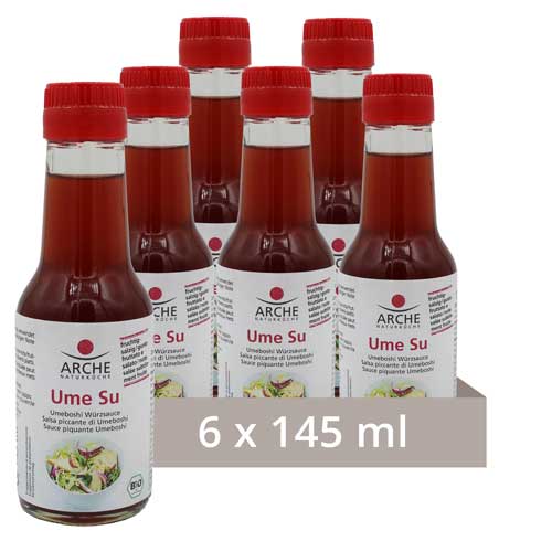 Der erste in Bio-Qualität! ARCHE Ume Su ist eine feinsäuerliche, fruchtige, vegane Würzsauce mit salziger Note. Sie bildet sich bei der Milchsäuregärung von Bio Umeboshi Aprikosen und kann wie Essig verwendet werden. Ume Su belebt Salatsaucen, Dips, Aufstriche und viele Gemüsegerichte.