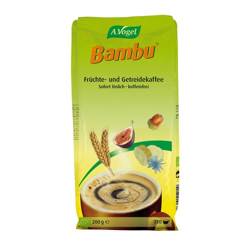Bambu Original ist ein Instantkaffee aus Früchten und Getreide mit sonnengereiften Feigen. Mit der besonderen Rezeptur aus Zichorie, Feigen, Weizen, gemälzter Gerste und Eicheln. Ohne Koffein. Ideales Getränk für die ganze Familie. Früchte- und Getreidekaffee, koffeinfrei, für die ganze Familie. Kann problemlos am Abend getrunken werden. Er schmeckt heiß oder kalt und kann mit Wasser oder Milch (Soja-, Reis- oder Kokosmilch) zubereitet werden.