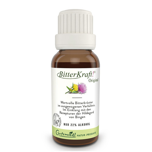 BitterKraft! Original ist eine Bitterstoff-Rezeptur, die auf dem berühmten Kräuterwissen von Hildegard von Bingen basiert. Es enthält eine 9-fach Kräutermischung, darunter Angelika- und Enzianwurzel, Kardamom, Ingwer und Artischocke, die zu den wertvollsten Bitterstoffen zählen.