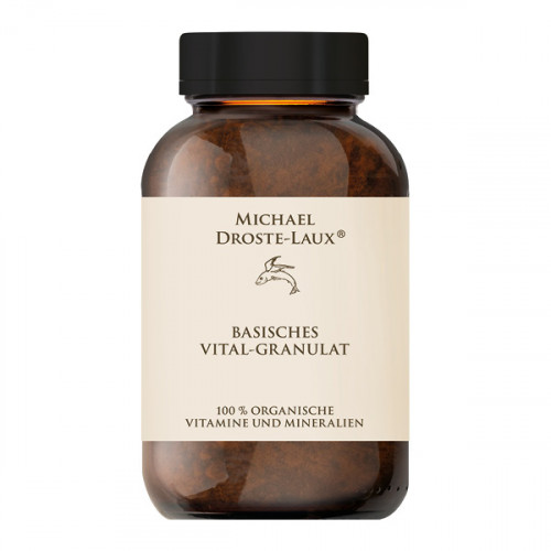 Michael Droste-Laux® Basisches Granulat ist ein Lebensmittel aus über 60 Zutaten. Die in pflanzlicher Form enthaltenen Mineralstoffe, Spurenelemente und Vitamine werden vom Organismus optimal aufgenommen. Das Basen bildende Granulat ist eine charakteristische Kostbarkeit. Die 49 Kräuter- Gewürz- Mischung, Kürbiskerne, Weizenkeime, fermentiertes Getreide, Apfelgranulat, Karotten, Mandelmehl, Sonnenblumenkerne, Topinambur, Walnüsse, Fenchel und Rote Beete stammen aus kontrolliert biologischem Anbau.