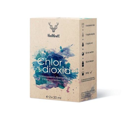 Das 2 Komponenten-Set besteht aus 22,5% Natriumchlorit und 3,5% Salzsäure in Violettglas-Pipettenflaschen zur Herstellung von Chlordioxid oder einer Chlordioxidlösung (CDL). Chlordioxid wird bereits seit langem zur Desinfektion von Trinkwasser oder auch Lebensmitteln eingesetzt.