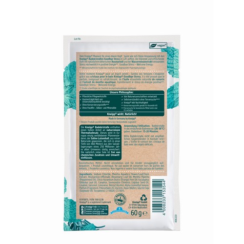 Dein Kneipp® Moment für einen klaren Kopf: Spüre wie sich DeineAnspannung mit den Kneipp® Badekristallen Goodbye Stress in Luft auflöst. Der klärende und erfrischende Duft mit natürlichem ätherischenRosmarinöl und der Wasserminzeextrakt verwandeln Stress nachweislichin positive Energie*. Goodbye Stress – Welcome Energy. Die Kneipp® Badekristalle enthalten einen hohen Anteil an naturreinem Thermalsolesalz. Dieses wird in Europas einzig verbliebener Pfannensiederei, der Saline Luisenhall, aus reiner Natursole gewonnen, die sich in einerTiefe von 460 Metern aus den Salzablagerungeneines 250 Millionen Jahrealten Urmeeres stetig anreichert.Die natürlich reine Sole ist frei vonchemischenZusätzen und Umwelteinflüssen. | * Wissenschaftliche Studie des Instituts für angewandte Psychophysiologie
