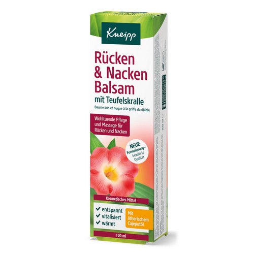 Der Kneipp® Rücken & Nacken Balsam enthält wertvollen Teufelskrallenextrakt, natürliches ätherisches Cajeputöl und eine wohlriechende Duftkombination ätherischer Öle. Die reichhaltige Formel mit hochwertiger Sheabutter, feuchtigkeitsregulierendem Mandelöl und pflegendem Sonnenblumenöl lässt sich leicht verteilen und ist gut geeignet bei der Anwendung einer Massage. Der Balsam kann in Kombination mit der Massage die Durchblutung anregen und einen angenehmen Wärmeeffekt entfalten. Beanspruchte Muskeln im Rücken- und Nackenbereich werden dadurch gelockert und entspannt.
