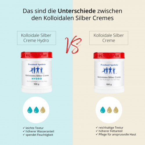 Die Kolloidales Silber Creme "Hydro" ist die "leichte" Variante unserer Kolloidales Silber Creme. Für die Herstellung wird eine verdünnte Basiscreme DAC verwendet. Da diese doppelt so viel Wasser und weniger Fett enthält, ist sie somit leichter auf die Haut aufzutragen.