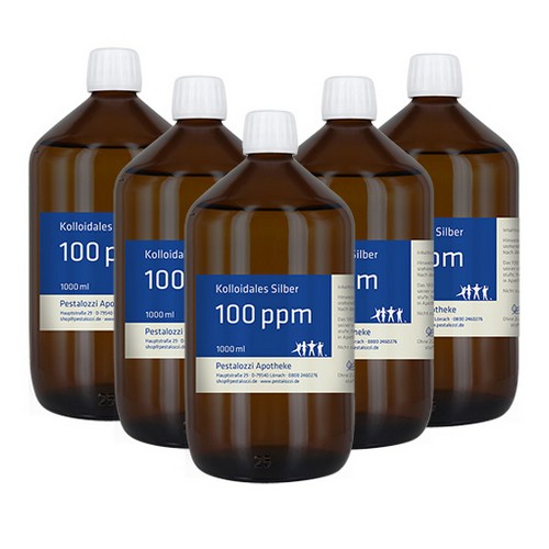 5 x 1000 ml "Kolloidales Silber - Pestalozzi Apotheke" in lichthemmender Apothekerbraunglasflasche