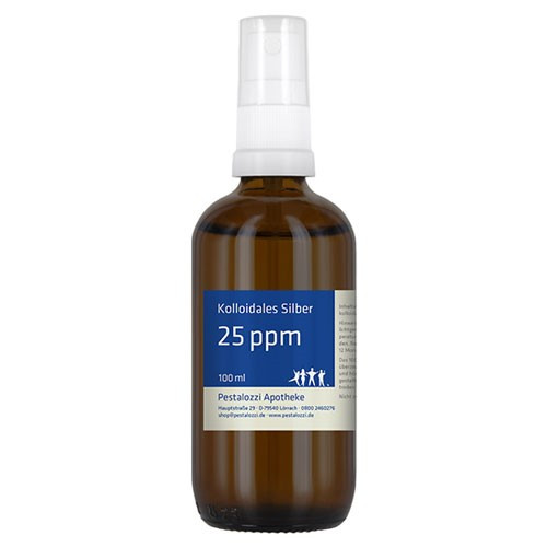Das kolloidale Silber 25 ppm wird mit hochreinem destillierten Wasser unter qualifizierten Laborbedingungen frisch hergestellt und in einer dunklen Glasflasche geliefert. Die Herstellung erfolgt in der Apotheke unter überwachten Laborbedingungen. Das kolloidale Silber wird auf elektrolytischem Wege mit Hilfe eines entsprechenden Generators hergestellt. Dabei werden aus 99,99% reinem Silber kleinste Partikel gebildet und in destilliertem Wasser verteilt. Wir arbeiten dabei ohne Einsatz von Zusatzstoffen. Bitte beachten Sie: Kolloidales Silber ist kein Arzneimittel und daher auch ohne Angabe einer Indikation. Aus rechtlichen Gründen bieten wir daher das kolloidale Silber nur für technische Zwecke an. Nicht zum Einnehmen.