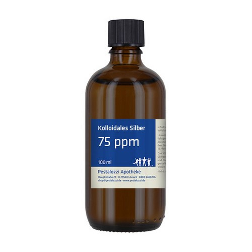 Das kolloidale Silber 75 ppm wird mit hochreinem destillierten Wasser unter qualifizierten Laborbedingungen frisch hergestellt und in einer dunklen Glasflasche geliefert. Die Herstellung erfolgt in der Apotheke unter überwachten Laborbedingungen. Das kolloidale Silber wird auf elektrolytischem Wege mit Hilfe eines entsprechenden Generators hergestellt. Dabei werden aus 99,99% reinem Silber kleinste Partikel gebildet und in destilliertem Wasser verteilt. Wir arbeiten dabei ohne Einsatz von Zusatzstoffen. Bitte beachten Sie: Kolloidales Silber ist kein Arzneimittel und daher auch ohne Angabe einer Indikation. Aus rechtlichen Gründen bieten wir daher das kolloidale Silber nur für technische Zwecke an. Nicht zum Einnehmen.