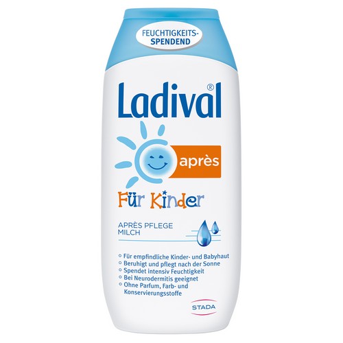 Nach dem Sonnenbaden die Haut sanft reinigen und gut abtrocknen. Anschließend die Après Pflege Milch auf die sonnengereizte Haut auftragen und einziehen lassen. Bei Bedarf wiederholen. Als passenden Sonnenschutz für die empfindliche Kinder- und Babyhaut oder bei Neurodermitis empfehlen wir die Serie Ladival® Für Kinder Sonnenschutz (als Milch, Creme oder Spray). Vor Gebrauch schütteln.
