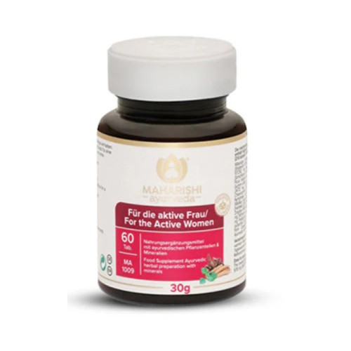Wässriger Extrakt aus: (Asparagus racemosus (Shatavari) 209/629 mg, Symplocos racemosa 121/363 mg, Saraca indica 97/291 mg, Mangifera indica (Mango) 60/182 mg, Mimosa pudica (Sinnpflanze) 44/133 mg, Boerhaavia diffusa 40/121 mg, Ficus religiosa 36/109 mg. Shilajit (Mumijo) 32/97 mg. Verdickungsmittel Gummi arabicum. Corallium rubrum (Koralle) 24/72 mg, Cyperus scariosus 20/60 mg, Mesua ferrea 20/60 mg, Aconitum heterophyllum 20/60 mg, Holarrhena antidysenterica 20/60 mg, Nymphaea stellata (Wasserlilie) 20/60 mg, Santalum album (Weißes Sandelholz) 20/60 mg, Terminalia chebula (Haritaki) 20/60 mg, Cuminum cyminum (Kreuzkümmel) 20/60 mg, Zingiber officinale (Ingwer) 20/60 mg, Piper longum (Pippali) 20/60 mg, Withania somnifera (Ashwagandha) 20/60 mg, Pavonia odorata 20/60 mg. Stärke (Mais/glutenfrei). Calciumcarbonat 18/55 mg. Wässriger Extrakt aus: Caesalpinia sappan 12/36 mg. Trennmittel Talkum, ayurvedisches elementares Eisen 5/15 mg.
