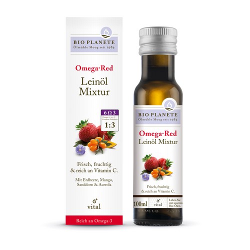 Die Leinöl Mixtur Omega Red verwöhnt mit einem außergewöhnlich fruchtigen Aroma und sorgt zudem für den täglichen Vitamin C- und Omega-3-Kick. Das Öl mit dem fruchtig-süßen Geschmack ist ideal für Joghurt, Müslis und Smoothies. Es ist besonders reich an den wertvollen Omega-3-Fettsäuren und Vitamin C.