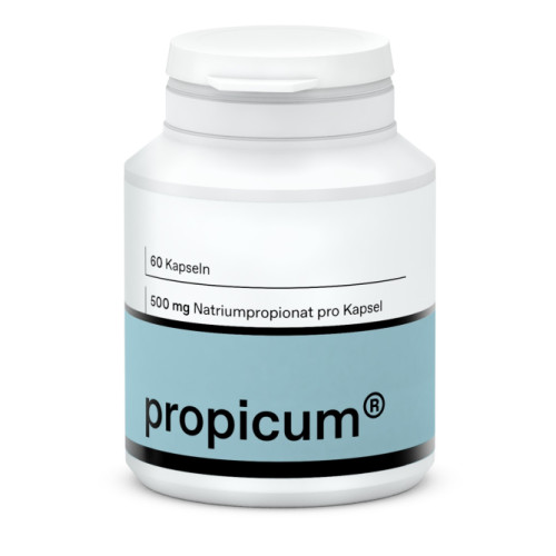 Darmbakterien produzieren bei der Verstoffwechselung von Ballaststoffen kurzkettige Fettsäuren (Short Chain Fatty Acids, SCFA). Dabei entsteht neben Essig- und Buttersäure die Propionsäure. Eine Kapsel Propicum enthält 500 mg Natriumpropionat, ein Salz der Propionsäure. Die Tagesdosis entspricht damit 1000 mg Natriumpropionat.
