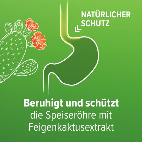 Schützt und beruhigt: die hochkonzentrierten pflanzlichen Schutzstoffen aus dem Feigenkaktus legen sich wie ein natürlicher Schutzfilm auf die angegriffene Schleimhaut der Speiseröhre. Bereits in der sizilianischen Volksmedizin wurde die Pflanze gegen säurebedingte Magenbeschwerden eingesetzt.