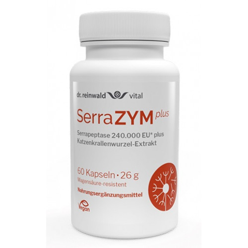 Die Serrapeptase weist eine Enzymaktivität auf und ist mit 240.000 EU* pro Tagesempfehlung hochdosiert. Zudem wird ein Katzenkrallen-Extrakt höchster Qualität verwendet. Das Pflanze-Extrakt-Verhältnis ist 10:1. D. h. eine Tagesmenge von 2 Kapseln SerraZYM plus liefert 600 mg ganzheitlich hochkonzentrierten Wurzelextrakts, welcher einer Pflanzentrockenmasse von 6 g entspricht.
