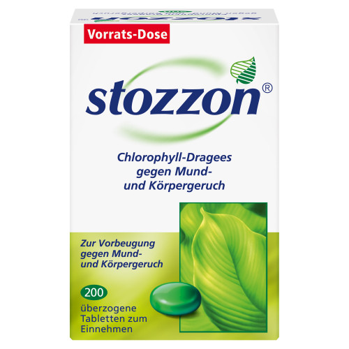 Stozzon Chlorophyll- Dragees gegen Mund- und Körpergeruch. Für Erwachsene und Jugendliche ab 12 Jahren. Wirkstoff: Chlorophyllin-Kupfer-Komplex, Natriumsalz. Anwendungsgebiete: Traditionell angewendet zur Vorbeugung gegen Mund- und Körpergeruch. Beim Auftreten von Krankheitszeichen sollte ein Arzt aufgesucht werden. Warnhinweise: Enthält Saccharose und Lactose.