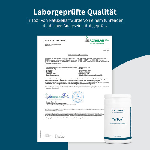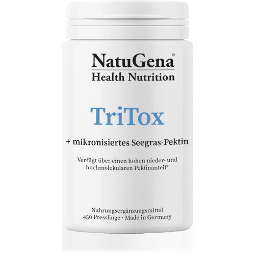 NatuGena TriTox®enthält eine ausgewogene Mischung aus zwei Chlorella-Arten (Chlorella pyrenoidosa und Chlorella vulgaris) sowie mikronisiertem Seegras-Pektin. Die Tagesdosis liefert insgesamt 3.036 mg Chlorella-Pulver, gleichmäßig verteilt auf beide Algenarten, und 3.038 mg Seegras-Pektin.